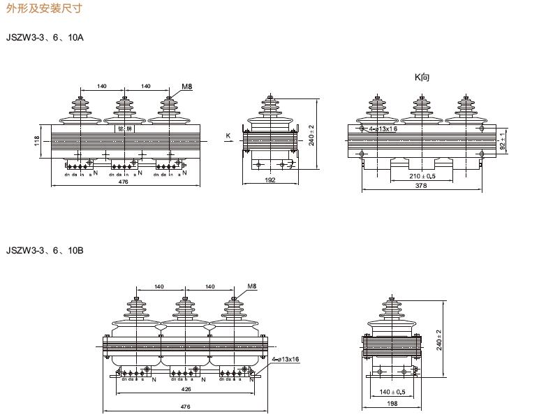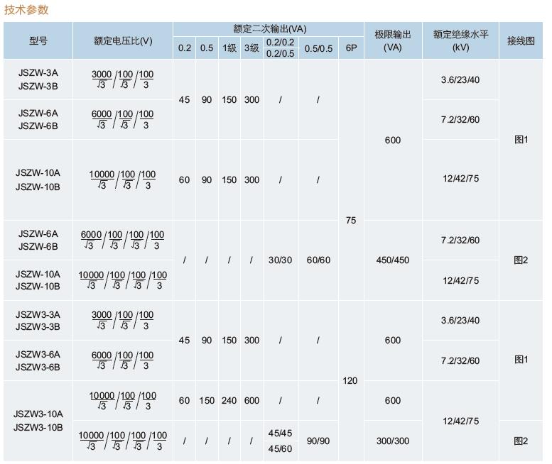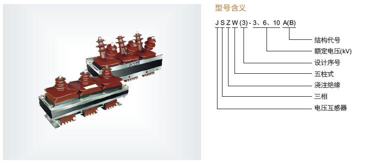 JSZW(3)-3、JSZW(3)-6、JSZW(3)-10A(B)型電壓互感器為戶內環氧樹脂全真空澆注結構。JSZW(3)-3、6、10A(B)型電壓互感器在系統使用時,每組需三個澆注體,套在三相五柱鐵芯上。計量繞組、 保護繞組分開。有效地保證了計量的準確性和保護的可靠功能。JSZW-10、JSZW-6 系列電壓互感器為三相、戶內、干式產品,JSZW3-10為Yo/Yo/連接。分別適用于額定頻率50H或60Hz,額定電壓為10kV電力系統中作電能計量、電壓監控和繼電保護用。